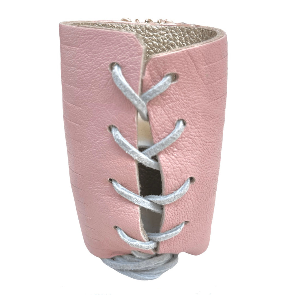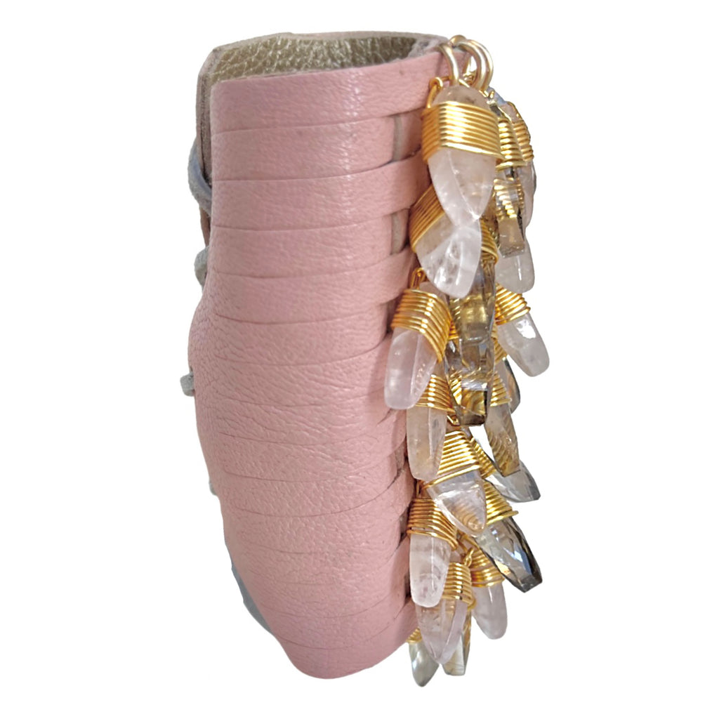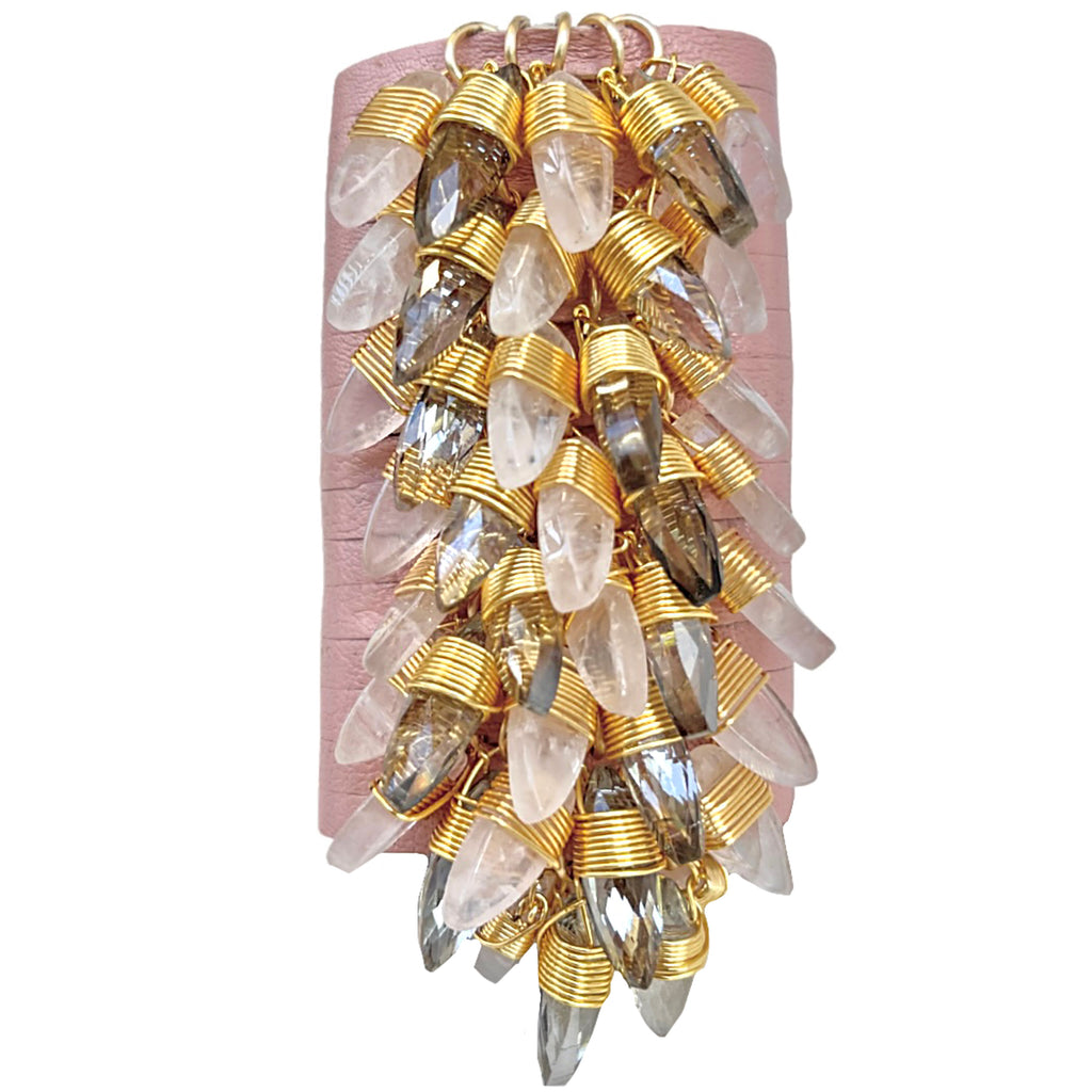 The Queen Bracelet comes in a variety of distinct leathers. It is hand-cut and reinforced to form the ideal shape. Crystals and/or stones are then hand placed in the center forming a flowing cascade of never ending style.