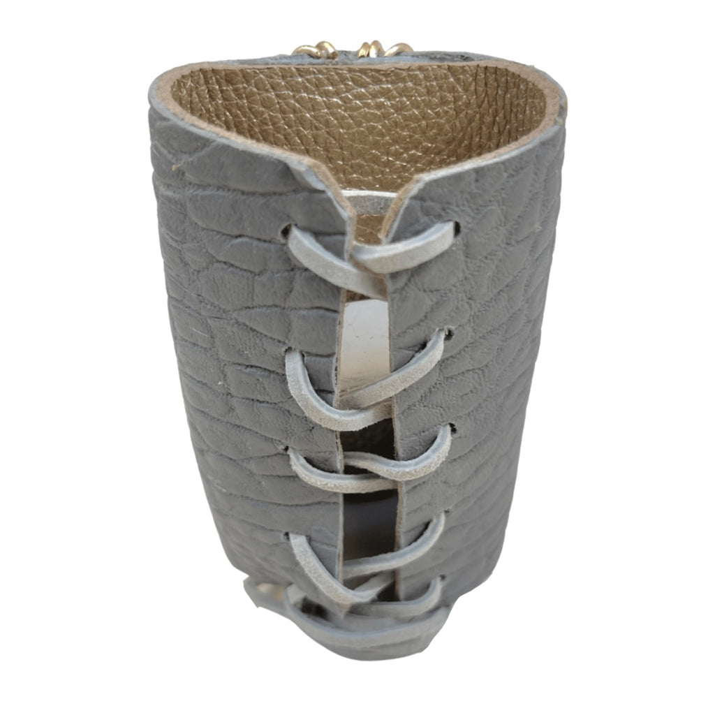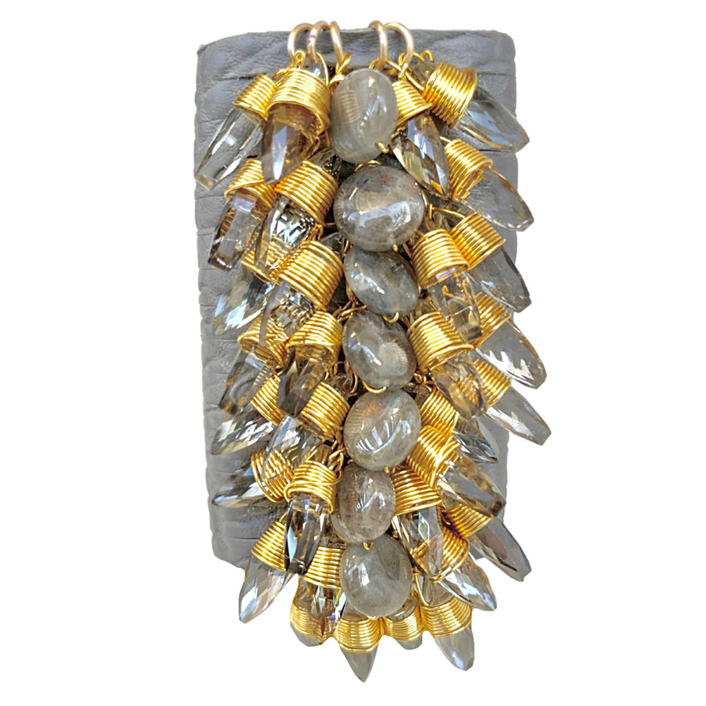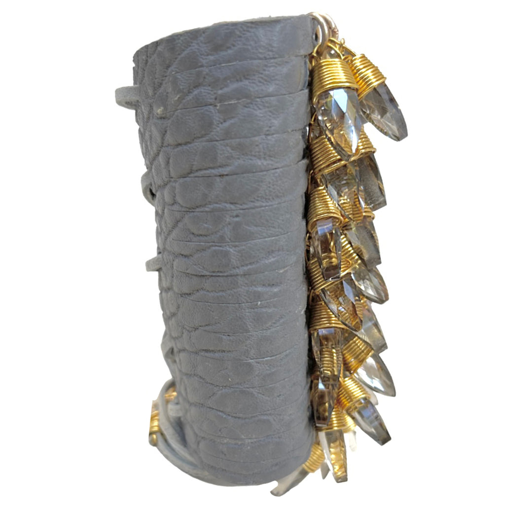 The Queen Bracelet comes in a variety of distinct leathers. It is hand-cut and reinforced to form the ideal shape. Crystals and/or stones are then hand placed in the center forming a flowing cascade of never ending style.